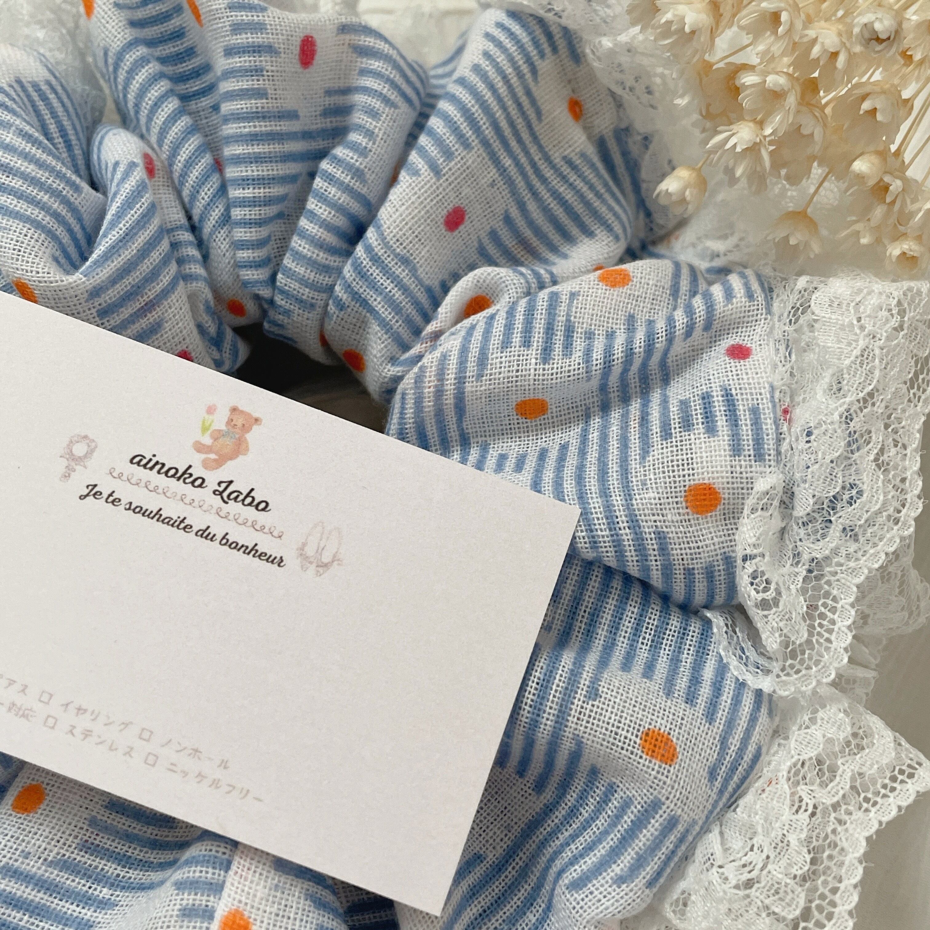 ✳︎ ストライプとお花 レースのふわふわ ビック シュシュ ✳︎