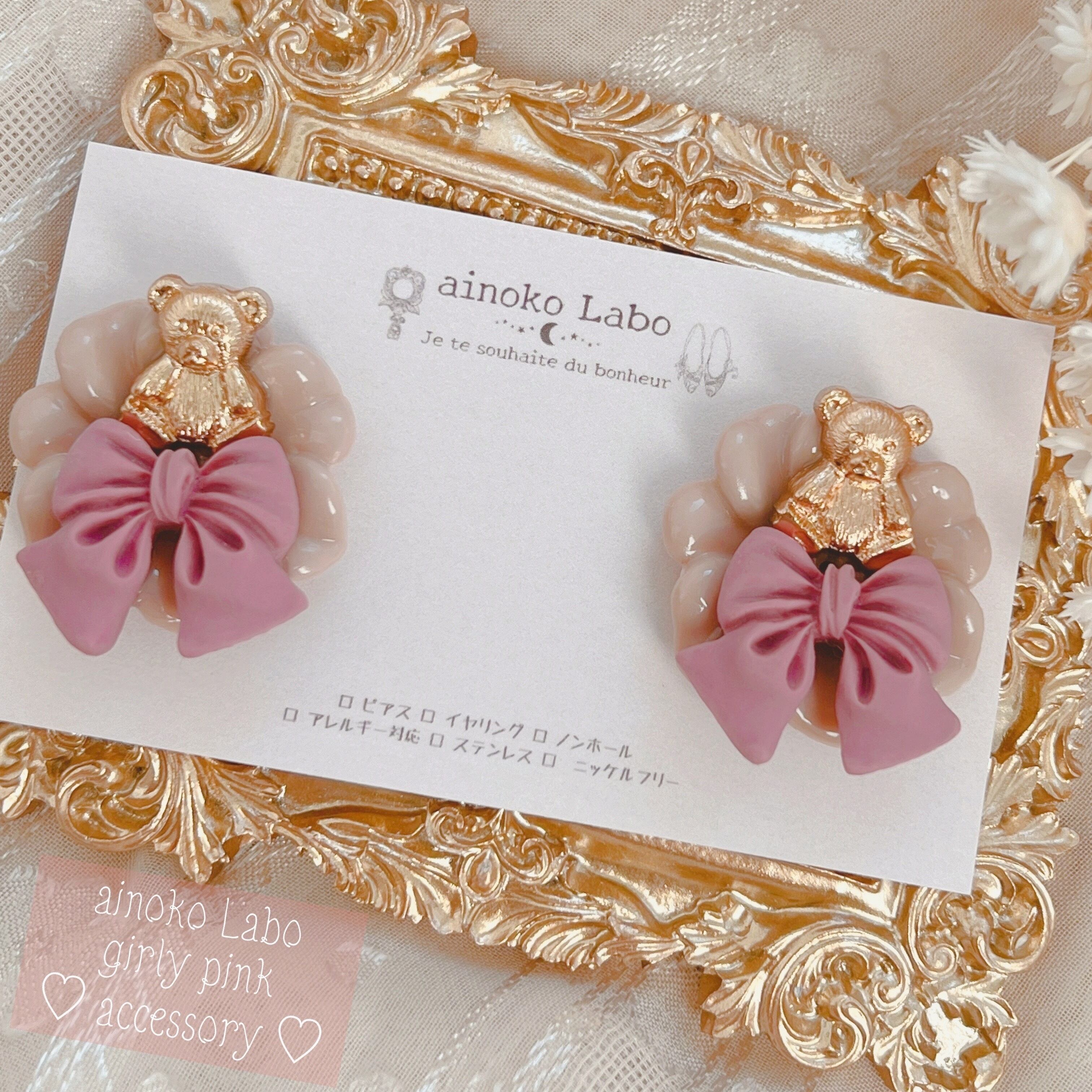 ✳︎ りぼんとくまちゃん pink girly 耳飾り ✳︎