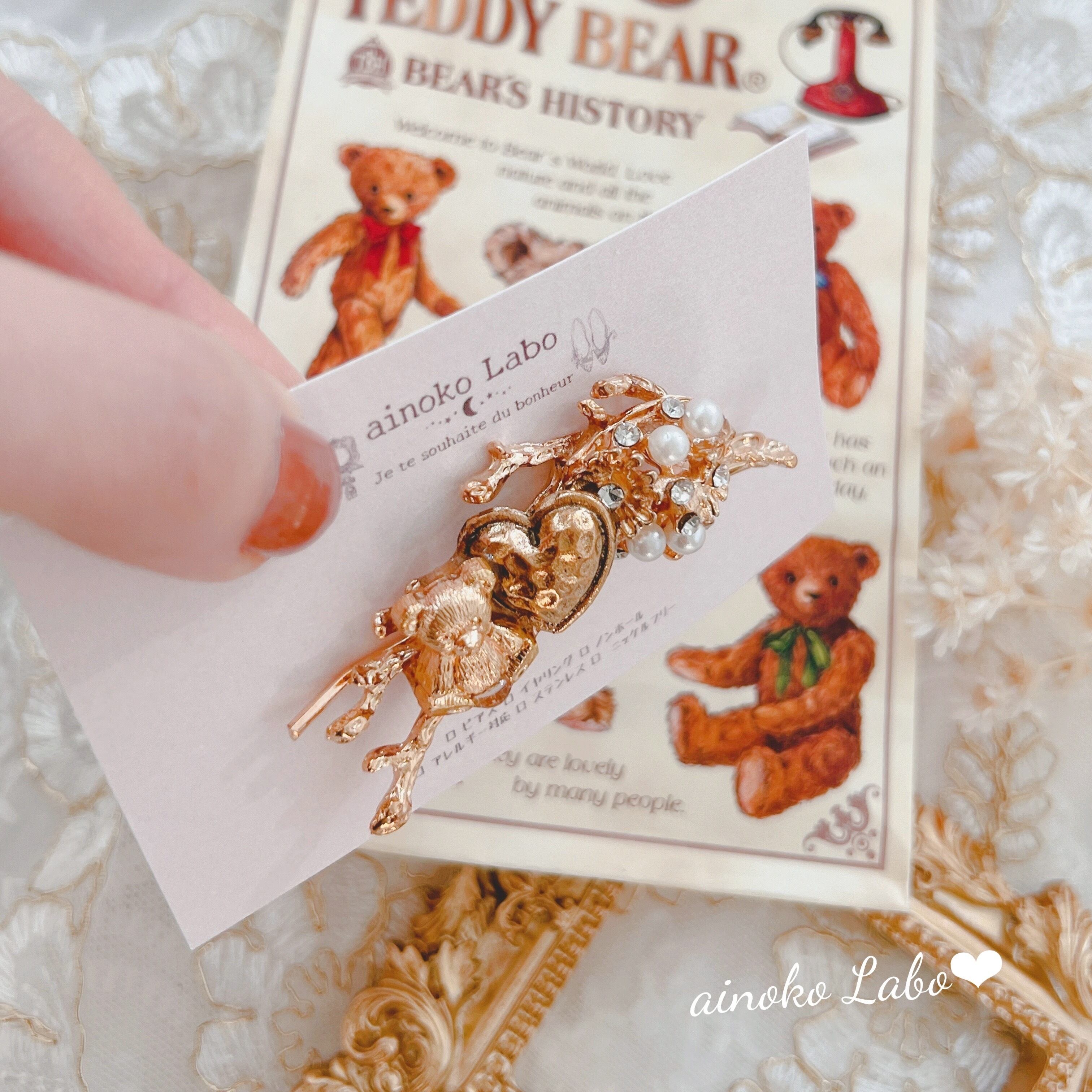 ✳︎ ミニテディベア ゴールドハート girlyヘアピン ✳︎