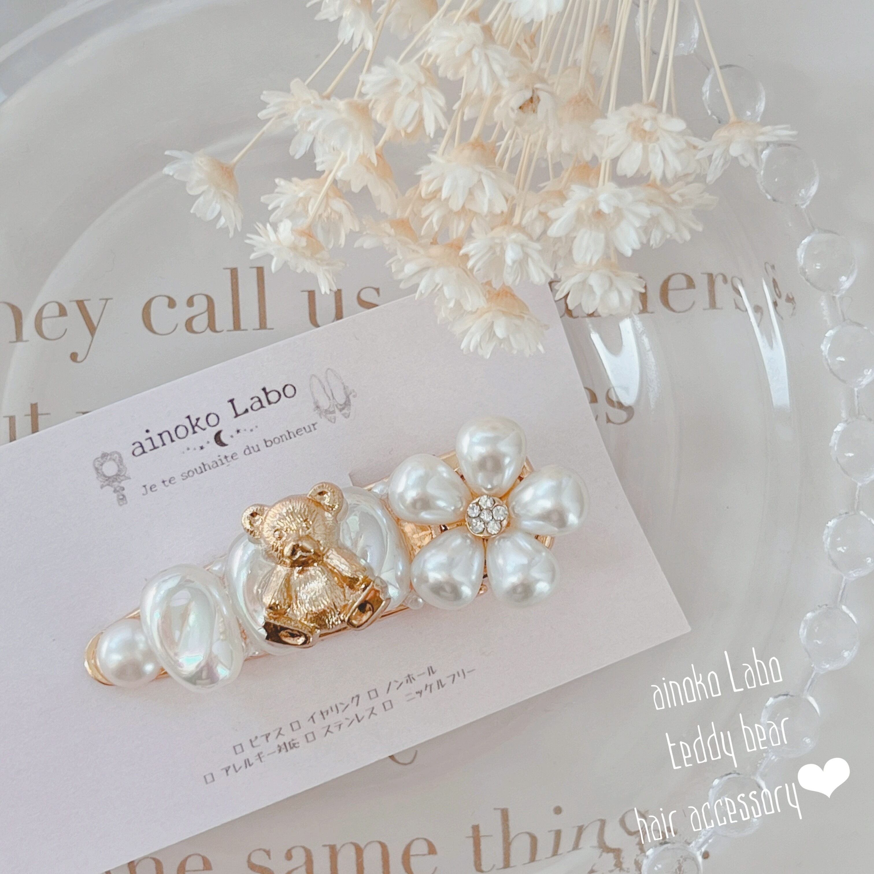 ✳︎ オーロラビーズとパールのお花 くまさん ヘアクリップ ✳︎