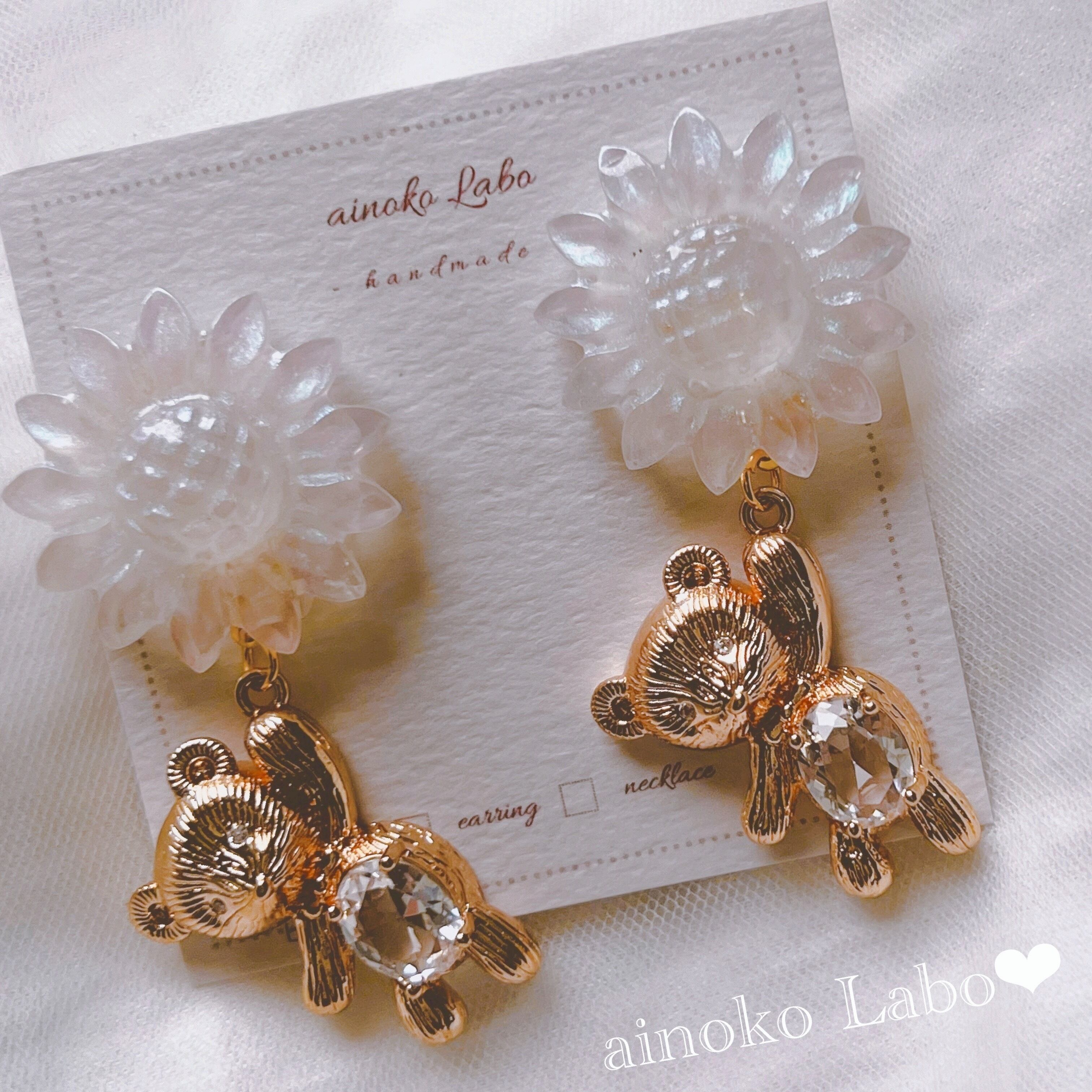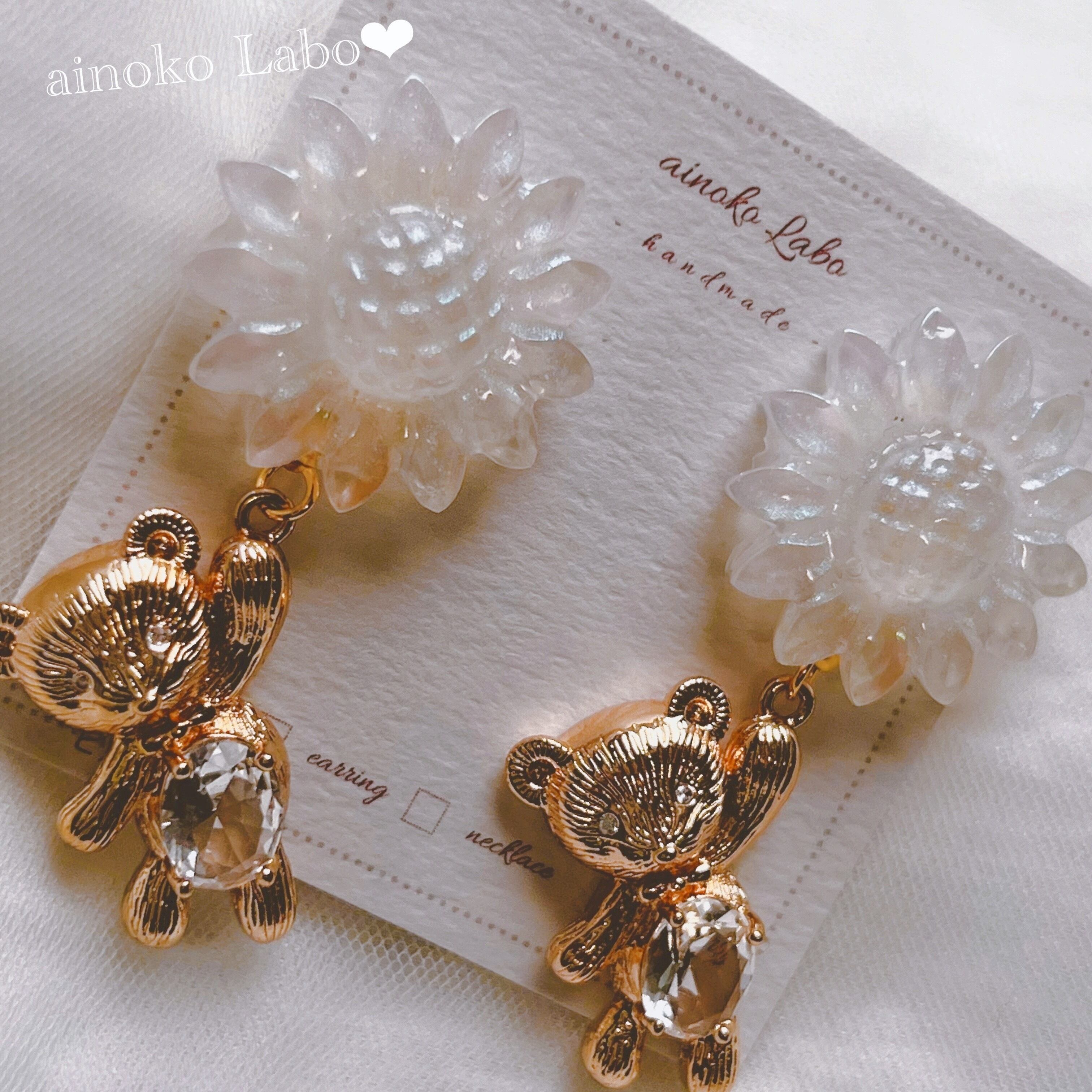 ✳︎ ゆらり くまさん お花 オーロラ ピアス ✳︎